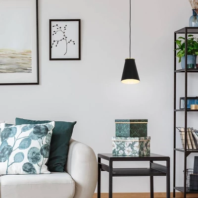 This Mid-Century Modern Pendant features a matte black metal shade with antique brass accents. Hanging from a fabric-wrapped suspension cord, this hip and cool pendant is ready to make your space look sleek and modern all at once.Smart home compatible, this item can also be set up using a smart outlet or switch (sold separately) to easily connect to Alexa, Google Home or any other smart home device.