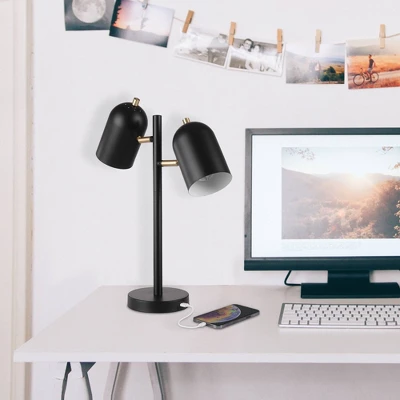 Ideal for a bedroom, office, den or living room, the Carter 2-Light Desk Lamp is functional as well as stylish. The classic design is modernized with a matte black finish and matte brass accents. Each lamp head can pivot and is controlled with a rotary switch on the shade so you can customize the amount of light and where you point it for each task. A fast charging USB port located on the base of the lamp lets you charge your phone or tablet as you work making this the perfect lamp for all situations.