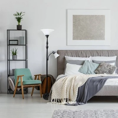Accent your traditional decor with this Restoration Bronze 2-Light Mother Daughter Floor Lamp from Elegant Designs. This two-light floor lamp designed with a slender frame and a built-in reading light is both versatile and classic in appeal. Enhanced with a restoration bronze finish and a white glass shade with swirl details, this decorative floor lamp brings a timeless look to your living room space. The tiered pedestal base offers it a sturdy foundation, while the three-way light setting allows you to easily control the light output. Just place this floor lamp beside an armchair or a sofa in the living room or your reading nook for warm and practical illumination.