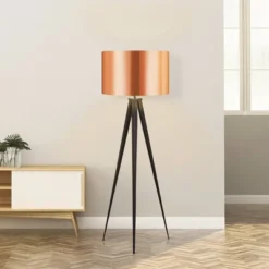 - Black finish over metal construction. White linen fabric drum shade. 8-foot long black cord.