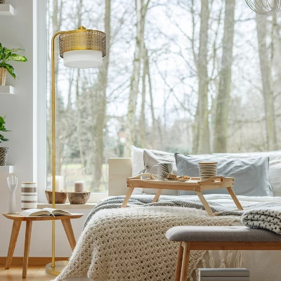 - Shade made from white fabric and gold-finish metal with cutouts