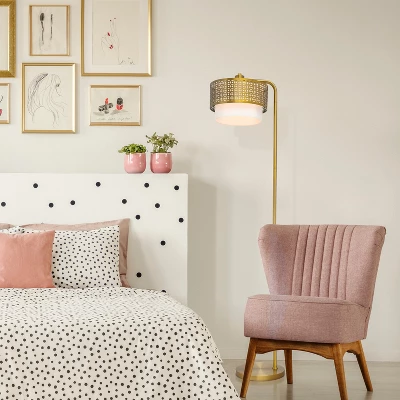This 65.25″ H Ximena Gold Drum Shade Floor Lamp from River of Goods offers a luxe lighting option that pairs well with modern or transitional decor. This floor lamp showcases a gold-finish metal candlestick base and a two-piece drum shade featuring a white fabric piece and gold-finish metal piece with cutout detailing. The lamp requires one 60-watt E26 bulb (not included) to cast a soft, warm glow, and the 90-inch cord with a foot switch allows for versatile placement in any room.