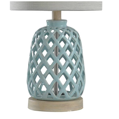 A cool new take on a vintage style, this ceramic table lamp is finished in a soft blue for a standout quality that’s equally easy to match. Made to meet exacting artisan standards, this lamp is designed with an open lattice body and fabric hardback shade in white. It’s a bold selection for bringing life to tabletops throughout your mid-century inspired decor. Accent your home décor with this Ceramic Table Lamp Blue from the Signature collection by StyleCraft Home Collection. This lamp will enhance your home with a perfect mix of form and function. The features include a blue finish applied by experts.. Comes in a clear finish. This piece exemplifies superior product design and great styling at an unbeatable price. This will pair well with modern styling and is sure to be a conversation piece. Regardless if you put it in the bedroom or family room, this lamp stands out. Suitable for residential use in a dry location. This table lamp is UL listed in compliance with the nationally recognized safety standards. Due to lighting and monitor differences, actual colors and finishes may vary slightly from what appears online