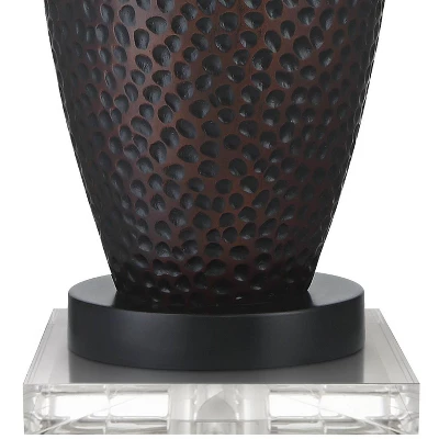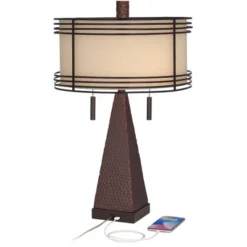 - Oiled bronze finish hammered resin construction. Black finish accents. Faux leather drum lamp shades. Round metal bottom bases with built-in 2A USB ports.