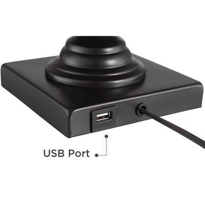 This set of two handsome table lamps offers a warm, inviting touch for your home. Each lamp features arresting curves atop a square base in a handsome bronze finish over a metal frame. A rich faux leather tapered drum shade tops each lamp for a further element of style, while the base USB ports add a contemporary touch to keep your devices fully charged.