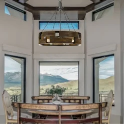 - Comes with 12-feet of wire and 6-feet of chain. Minimum hanging height is 23″. Sloped ceiling adaptable.